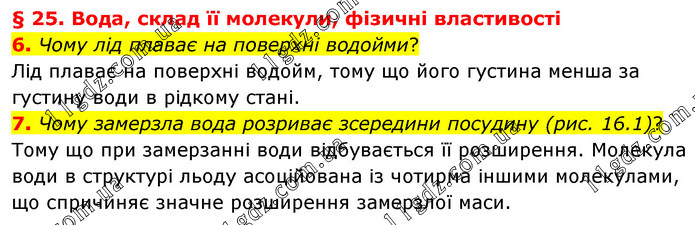 § 25. Вода, склад її молекули, фізичні властивості 6. Чому лід плаває на поверхні водойми? Лід плаває на поверхні водойм, тому що його густина менша за густину води в рідкому стані. 7. Чому замерзла вода розриває зсередини посудину (рис. 16.1)? Тому що при замерзанні води відбувається її розширення. Молекула води в структурі льоду асоційована із чотирма іншими молекулами, що спричиняє значне розширення замерзлої маси.