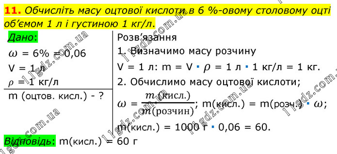 11. Обчисліть масу оцтової кислоти в 6 %-овому столовому оцті об’ємом 1 л і густиною 1 кг/л. Розв’язання 1. Визначимо масу розчину V = 1 л: m = V ∙ ρ = 1 л ∙ 1 кг/л = 1 кг. 2. Обчислимо масу оцтової кислоти; ω = (m (кисл.))/(m(розчин)); m(кисл.) = m(розч.) ∙ ω; m(кисл.) = 1000 г ∙ 0,06 = 60. Відповідь: m(кисл.) = 60 г