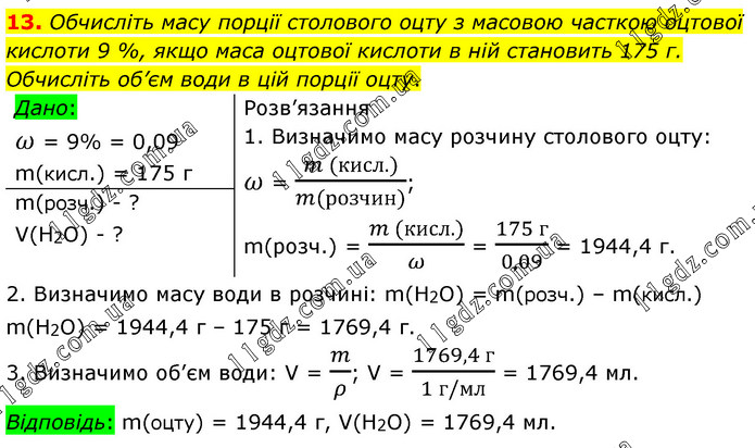 Обчисліть масу порції столового оцту з масовою часткою оцтової кислоти 9 %, якщо маса оцтової кислоти в ній становить 175 г. Обчисліть об’єм води в цій порції оцту. Розв’язання 1. Визначимо масу розчину столового оцту: ω = (m (кисл.))/(m(розчин)); m(розч.) = (m (кисл.))/ω = (175 г)/0,09 = 1944,4 г. 2. Визначимо масу води в розчині: m(Н2O) = m(розч.) – m(кисл.) m(Н2O) = 1944,4 г – 175 г = 1769,4 г. 3. Визначимо об’єм води: V = m/ρ; V = (1769,4 г)/(1 г/мл) = 1769,4 мл. Відповідь: m(оцту) = 1944,4 г, V(Н2O) = 1769,4 мл. Відповідь: m(NaСl) = 9 г; m(Н2O) = 991 г.