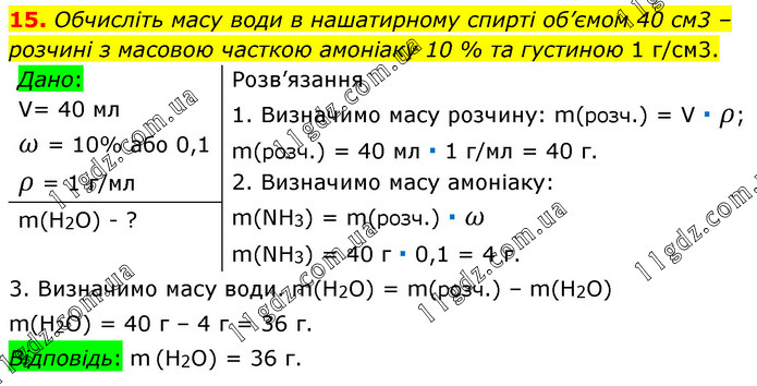 Обчисліть масу води в нашатирному спирті об’ємом 40 см3 – розчині з масовою часткою амоніаку 10 % та густиною 1 г/см3. Розв’язання 1. Визначимо масу розчину: m(розч.) = V ∙ ρ; m(розч.) = 40 мл ∙ 1 г/мл = 40 г. 2. Визначимо масу амоніаку: m(NН3) = m(розч.) ∙ ω m(NН3) = 40 г ∙ 0,1 = 4 г. 3. Визначимо масу води. m(Н2О) = m(розч.) – m(Н2O) m(Н2O) = 40 г – 4 г = 36 г. Відповідь: m (Н2O) = 36 г.