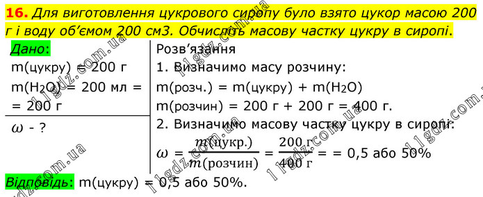 Для виготовлення цукрового сиропу було взято цукор масою 200 г і воду об’ємом 200 см3. Обчисліть масову частку цукру в сиропі. Розв’язання 1. Визначимо масу розчину: m(розч.) = m(цукру) + m(Н2O) m(розчин) = 200 г + 200 г = 400 г. 2. Визначимо масову частку цукру в сиропі: ω = (m(цукр.))/(m(розчин)) = (200 г)/(400 г) = = 0,5 або 50% Відповідь: m(цукру) = 0,5 або 50%.