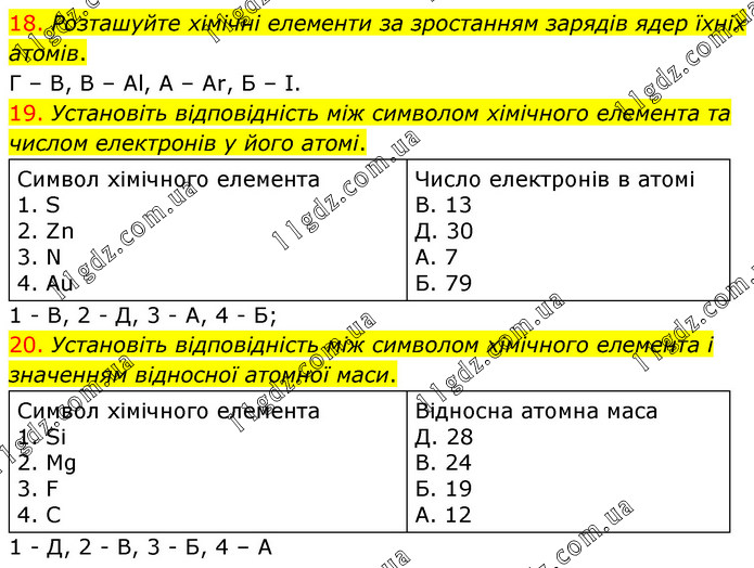 18. Розташуйте хімічні елементи за зростанням зарядів ядер їхніх атомів. Г – В, В – Al, А – Ar, Б – I. 19. Установіть відповідність між символом хімічного елемента та числом електронів у його атомі. 1 - В, 2 - Д, 3 - А, 4 - Б; 20. Установіть відповідність між символом хімічного елемента і значенням відносної атомної маси. 1 - Д, 2 - В, 3 - Б, 4 – А