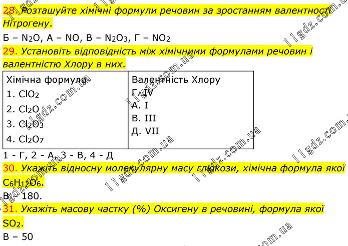 28. Розташуйте хімічні формули речовин за зростанням валентності Нітрогену. Б – N2O, А – NО, В – N2O3, Г – NO2 29. Установіть відповідність між хімічними формулами речовин і валентністю Хлору в них. 1 - Г, 2 - А, 3 - В, 4 - Д 30. Укажіть відносну молекулярну масу глюкози, хімічна формула якої С6Н12О6. В – 180. 31. Укажіть масову частку (%) Оксигену в речовині, формула якої SO2. В – 50