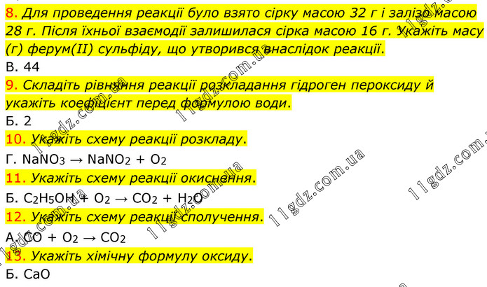 8. Для проведення реакції було взято сірку масою 32 г і залізо масою 28 г. Після їхньої взаємодії залишилася сірка масою 16 г. Укажіть масу (г) ферум(ІІ) сульфіду, що утворився внаслідок реакції. В. 44 9. Складіть рівняння реакції розкладання гідроген пероксиду й укажіть коефіцієнт перед формулою води. Б. 2 10. Укажіть схему реакції розкладу. Г. NaNO3 → NaNO2 + O2 11. Укажіть схему реакції окиснення. Б. C2H5OH + O2 → CO2 + H2O 12. Укажіть схему реакції сполучення. А. CO + O2 → CO2 13. Укажіть хімічну формулу оксиду. Б. CaO