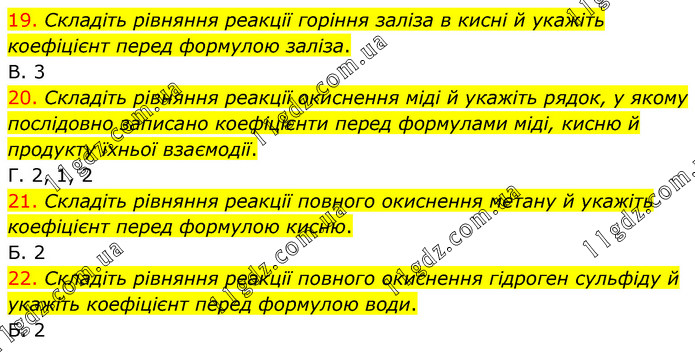 19. Складіть рівняння реакції горіння заліза в кисні й укажіть коефіцієнт перед формулою заліза. В. 3 20. Складіть рівняння реакції окиснення міді й укажіть рядок, у якому послідовно записано коефіцієнти перед формулами міді, кисню й продукту їхньої взаємодії. Г. 2, 1, 2 21. Складіть рівняння реакції повного окиснення метану й укажіть коефіцієнт перед формулою кисню. Б. 2 22. Складіть рівняння реакції повного окиснення гідроген сульфіду й укажіть коефіцієнт перед формулою води. Б. 2
