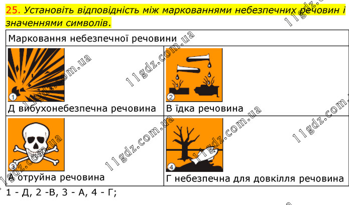 25. Установіть відповідність між маркованнями небезпечних речовин і значеннями символів. 1 - Д, 2 -В, 3 - А, 4 - Г;