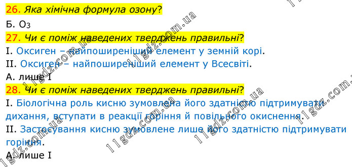 26. Яка хімічна формула озону? Б. O3 27. Чи є поміж наведених тверджень правильні? І. Оксиген – найпоширеніший елемент у земній корі. ІІ. Оксиген – найпоширеніший елемент у Всесвіті. А. лише І 28. Чи є поміж наведених тверджень правильні? І. Біологічна роль кисню зумовлена його здатністю підтримувати дихання, вступати в реакції горіння й повільного окиснення. ІІ. Застосування кисню зумовлене лише його здатністю підтримувати горіння. А. лише І