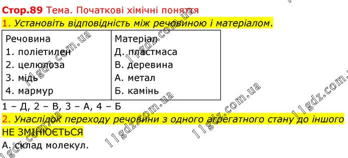 Стор.89 Тема. Початкові хімічні поняття 1. Установіть відповідність між речовиною і матеріалом. 1 – Д, 2 – В, 3 – А, 4 – Б 2. Унаслідок переходу речовини з одного агрегатного стану до іншого НЕ ЗМІНЮЄТЬСЯ А. склад молекул.
