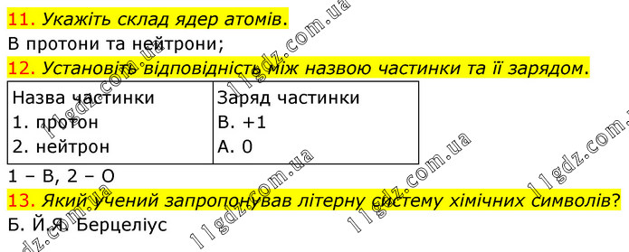 11. Укажіть склад ядер атомів. В протони та нейтрони; 12. Установіть відповідність між назвою частинки та її зарядом. 1 – В, 2 – О 13. Який учений запропонував літерну систему хімічних символів? Б. Й.Я. Берцеліус