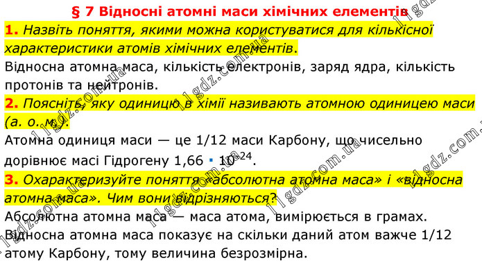 § 7 Відносні атомні маси хімічних елементів 1. Назвіть поняття, якими можна користуватися для кількісної характеристики атомів хімічних елементів. Відносна атомна маса, кількість електронів, заряд ядра, кількість протонів та нейтронів. 2. Поясніть, яку одиницю в хімії називають атомною одиницею маси (а. о. м.). Атомна одиниця маси — це 1/12 маси Карбону, що чисельно дорівнює масі Гідрогену 1,66 ∙ 10-24. 3. Охарактеризуйте поняття «абсолютна атомна маса» і «відносна атомна маса». Чим вони відрізняються? Абсолютна атомна маса — маса атома, вимірюється в грамах. Відносна атомна маса показує на скільки даний атом важче 1/12 атому Карбону, тому величина безрозмірна.