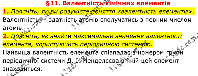 §11. Валентність хімічних елементів 1. Поясніть, як ви розумієте поняття «валентність елементів». Валентність — здатність атомів сполучатись з певним числом атомів. 2. Поясніть, як знайти максимальне значення валентності елемента, користуючись періодичною системою. Найвища валентність елемента співпадає з номером групи періодичної системи Д. І. Менделєєва в якій цей елемент знаходиться.