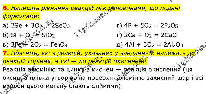 6. Напишіть рівняння реакцій між речовинами, що подані формулами: а) 2Se + 3O2 = 2SeO3 б) Si + O2 = SiO2 в) 3Fe + 2O2 = Fe3O4 г) 4P + 5O2 = 2Р2O5 ґ) 2Са + O2 = 2СаО д) 4Аl + 3O2 = 2Аl2O3 7. Поясніть, які з реакцій, указаних у завданні 5, належать до реакцій горіння, а які — до реакцій окиснення. Реакція алюмінію та цинку з киснем — реакція окислення (ця оксидна плівка утворює на поверхні алюмінію захисний шар і всі вироби цього металу стають стійкими).