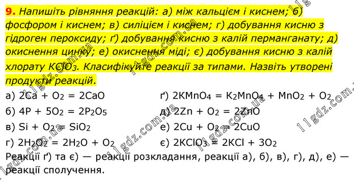 9. Напишіть рівняння реакцій: а) між кальцієм і киснем; б) фосфором і киснем; в) силіцієм і киснем; г) добування кисню з гідроген пероксиду; ґ) добування кисню з калій перманганату; д) окиснення цинку; е) окиснення міді; є) добування кисню з калій хлорату КСlО3. Класифікуйте реакції за типами. Назвіть утворені продукти реакцій. а) 2Са + O2 = 2СаО б) 4Р + 5O2 = 2Р2O5 в) Sі + O2 = SіO2 г) 2Н2O2 = 2Н2O + O2 ґ) 2КМnO4 = К2МnO4 + МnO2 + O2 д) 2Zn + O2 = 2ZnО е) 2Сu + O2 = 2СuО є) 2КСlO3 = 2КСl + 3O2 Реакції ґ) та є) — реакції розкладання, реакції а), б), в), г), д), е) — реакції сполучення.
