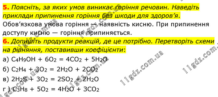 Поясніть, за яких умов виникає горіння речовин. Наведіть приклади припинення горіння без шкоди для здоров’я. Обов’язкова умова горіння — наявність кисню. При припинення доступу кисню — горіння припиняється. 6. Допишіть продукти реакцій, де це потрібно. Перетворіть схеми на рівняння, поставивши коефіцієнти: а) С4Н9ОН + 6O2 = 4СO2 + 5Н2O б) С2Н4 + 3O2 = 2Н2O + 2СO2 в) 2Н2S + 3O2 = 2SO2 + 2Н2O г ) С3Н8 + 5O2 = 4Н2O + ЗСO2