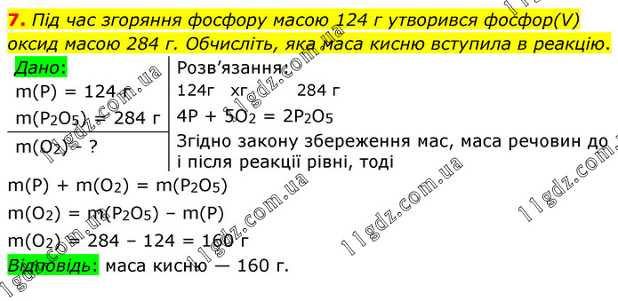 7. Під час згоряння фосфору масою 124 г утворився фосфор(V) оксид масою 284 г. Обчисліть, яка маса кисню вступила в реакцію. Розв’язання: 124г хг 284 г 4Р + 5О2 = 2Р2О5 Згідно закону збереження мас, маса речовин до і після реакції рівні, тоді m(Р) + m(O2) = m(Р2O5) m(O2) = m(Р2O5) – m(Р) m(O2) = 284 – 124 = 160 г Відповідь: маса кисню — 160 г.