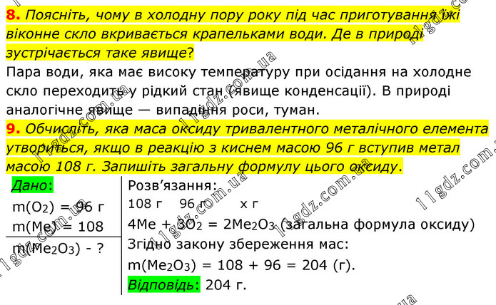 8. Поясніть, чому в холодну пору року під час приготування їжі віконне скло вкривається крапельками води. Де в природі зустрічається таке явище? Пара води, яка має високу температуру при осідання на холодне скло переходить у рідкий стан (явище конденсації). В природі аналогічне явище — випадіння роси, туман. 9. Обчисліть, яка маса оксиду тривалентного металічного елемента утвориться, якщо в реакцію з киснем масою 96 г вступив метал масою 108 г. Запишіть загальну формулу цього оксиду. Розв’язання: 108 г 96 г х г 4Ме + 3O2 = 2Ме2O3 (загальна формула оксиду) Згідно закону збереження мас: m(Ме2O3) = 108 + 96 = 204 (г). Відповідь: 204 г.