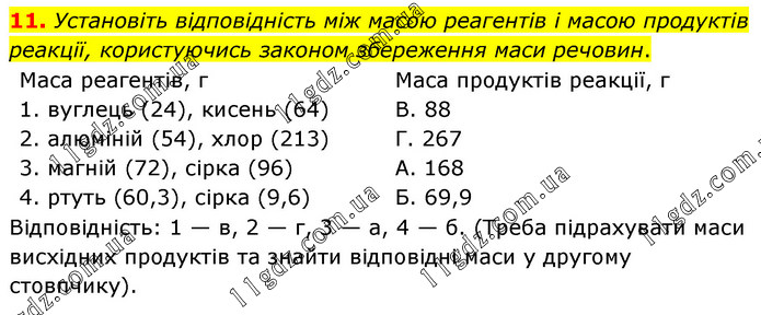 11. Установіть відповідність між масою реагентів і масою продуктів реакції, користуючись законом збереження маси речовин. Маса реагентів, г 1. вуглець (24), кисень (64) 2. алюміній (54), хлор (213) 3. магній (72), сірка (96) 4. ртуть (60,3), сірка (9,6) Маса продуктів реакції, г В. 88 Г. 267 А. 168 Б. 69,9 Відповідність: 1 — в, 2 — г, 3 — а, 4 — б. (Треба підрахувати маси висхідних продуктів та знайти відповідні маси у другому стовпчику).