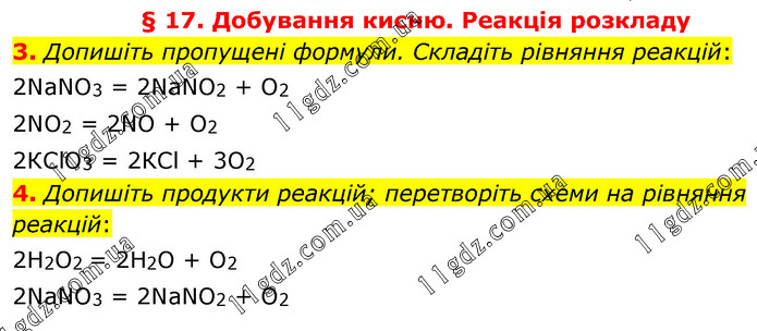 § 17. Добування кисню. Реакція розкладу 3. Допишіть пропущені формули. Складіть рівняння реакцій: 2NaNO3 = 2NaNO2 + O2 2NO2 = 2NO + O2 2КСlO3 = 2КСl + 3O2 4. Допишіть продукти реакцій; перетворіть схеми на рівняння реакцій: 2Н2O2 = 2Н2O + O2 2NaNO3 = 2NaNO2 + O2