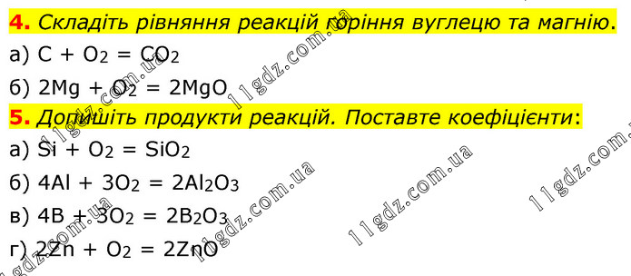 4. Складіть рівняння реакцій горіння вуглецю та магнію. а) С + O2 = СO2 б) 2Mg + O2 = 2MgO 5. Допишіть продукти реакцій. Поставте коефіцієнти: а) Si + O2 = SiO2 б) 4Аl + 3O2 = 2Аl2O3 в) 4В + 3O2 = 2В2O3 г) 2Zn + O2 = 2ZnO