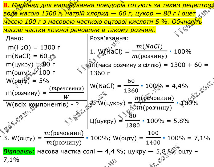 8. Маринад для маринування помідорів готують за таким рецептом: вода масою 1300 г, натрій хлорид — 60 г, цукор — 80 г і оцет масою 100 г з масовою часткою оцтової кислоти 5 %. Обчисліть масові частки кожної речовини в такому розчині. Розв’язання: 1. W(NaCl) = (m(NaCl))/(m(розчину)) ∙ 100% m(маса розчину з сіллю) = 1300 + 60 = 1360 г W(NaCl) = 60/1360 ∙ 100% = 4,4% 2. W(цукру) = (m(речовини))/(m(розчину)) ∙ 100% Ц(цукру) = 80/1380 ∙ 100% = 5,8% 3. W(оцту) = (m(речовини))/(m(розчину)) ∙ 100%; W(оцту) = 100/1400 ∙ 100% = 7,1% Відповідь: масова частка солі — 4,4 %; цукру — 5,8 %, оцту – 7,1%