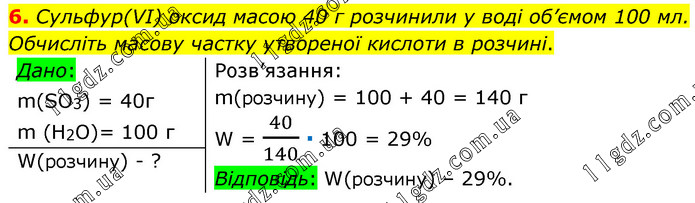 Сульфур(VI) оксид масою 40 г розчинили у воді об’ємом 100 мл. Обчисліть масову частку утвореної кислоти в розчині. Розв’язання: m(розчину) = 100 + 40 = 140 г W = 40/140 ∙ 100 = 29% Відповідь: W(розчину) – 29%.