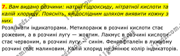 Вам видано розчини: натрій гідроксиду, нітратної кислоти та калій хлориду. Поясніть, як дослідним шляхом виявити кожну з них. Розпізнати індикаторами. Метилоранж в розчині кислоти стає рожевим, а в розчині лугу — жовтим. Лакмус в розчині кислоти стає червоним, в розчині лугу — синім. Фенолфталеїн в лужному розчині стає малиновим. Калій хлорид не змінює колір індикаторів.