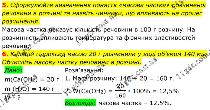 5. Сформулюйте визначення поняття «масова частка» розчиненої речовини в розчині та назвіть чинники, що впливають на процес розчинення. Масова частка показує кількість речовини в 100 г розчину. На розчинність впливають температура та фізичних властивостей речовин. 6. Кальцій гідроксид масою 20 г розчинили у воді об’ємом 140 мл. Обчисліть масову частку речовини в розчині. Розв’язання: 1. Маса розчину: 140 + 20 = 160 г. 2. W(Ca(OH2) = 20/160 ∙ 100% = 12,5% Відповідь: масова частка – 12,5%.