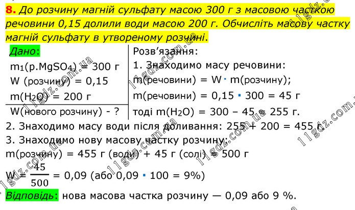 До розчину магній сульфату масою 300 г з масовою часткою речовини 0,15 долили води масою 200 г. Обчисліть масову частку магній сульфату в утвореному розчині. Розв’язання: 1. Знаходимо масу речовини: m(речовини) = W ∙ m(розчину); m(речовини) = 0,15 ∙ 300 = 45 г тоді m(Н2O) = 300 – 45 = 255 г. 2. Знаходимо масу води після доливання: 255 + 200 = 455 г. 3. Знаходимо нову масову частку розчину: m(розчину) = 455 г (води) + 45 г (солі) = 500 г W = 45/500 = 0,09 (або 0,09 ∙ 100 = 9%) Відповідь: нова масова частка розчину — 0,09 або 9 %.