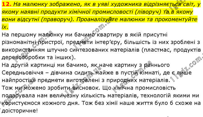На малюнку зображено, як в уяві художника відрізняється світ, у якому наявні продукти хімічної промисловості (ліворуч) та в якому вони відсутні (праворуч). Проаналізуйте малюнки та прокоментуйте їх. На першому малюнку ми бачимо квартиру в якій присутні різноманітні пристрої, предмети інтер’єру, більшість із них зроблені з використанням штучно синтезованих матеріалів (пластмас, продуктів деревообробки та інших). На другій картинці ми бачимо, як наче картину з раннього Середньовіччя – дівчина сидить майже в пустій кімнаті, де є лише найпростіші предмети виготовлені з природних матеріалів. Тож ми можемо зробити висновок. Що хімічна промисловість подарувала нам величезну кількість матеріалів, технологій якими ми користуємося кожного дня. Тож без хімії наше життя було б схоже на доісторичне!