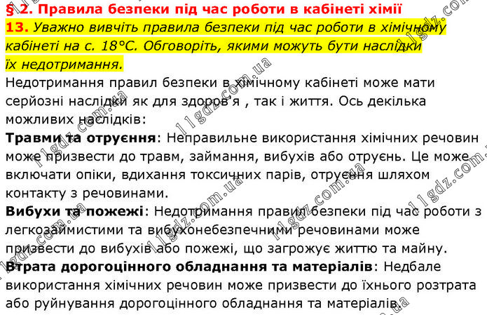 § 2. Правила безпеки під час роботи в кабінеті хімії 13. Уважно вивчіть правила безпеки під час роботи в хімічному кабінеті на с. 18°С. Обговоріть, якими можуть бути наслідки їх недотримання. Недотримання правил безпеки в хімічному кабінеті може мати серйозні наслідки як для здоров'я , так і життя. Ось декілька можливих наслідків: Травми та отруєння: Неправильне використання хімічних речовин може призвести до травм, займання, вибухів або отруєнь. Це може включати опіки, вдихання токсичних парів, отруєння шляхом контакту з речовинами. Вибухи та пожежі: Недотримання правил безпеки під час роботи з легкозаймистими та вибухонебезпечними речовинами може призвести до вибухів або пожежі, що загрожує життю та майну. Втрата дорогоцінного обладнання та матеріалів: Недбале використання хімічних речовин може призвести до їхнього розтрата або руйнування дорогоцінного обладнання та матеріалів.