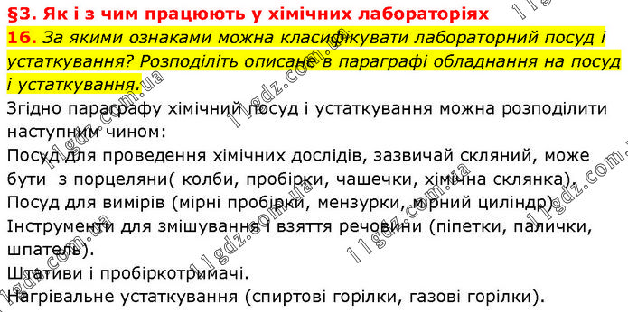 §3. Як і з чим працюють у хімічних лабораторіях 16. За якими ознаками можна класифікувати лабораторний посуд і устаткування? Розподіліть описане в параграфі обладнання на посуд і устаткування. Згідно параграфу хімічний посуд і устаткування можна розподілити наступним чином: Посуд для проведення хімічних дослідів, зазвичай скляний, може бути з порцеляни( колби, пробірки, чашечки, хімічна склянка). Посуд для вимірів (мірні пробірки, мензурки, мірний циліндр) Інструменти для змішування і взяття речовини (піпетки, палички, шпатель). Штативи і пробіркотримачі. Нагрівальне устаткування (спиртові горілки, газові горілки).
