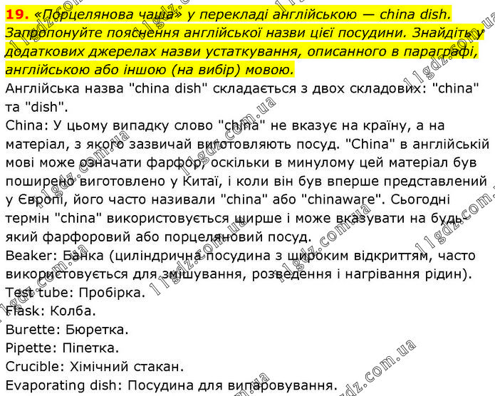 «Порцелянова чаша» у перекладі англійською — china dish. Запропонуйте пояснення англійської назви цієї посудини. Знайдіть у додаткових джерелах назви устаткування, описанного в параграфі, англійською або іншою (на вибір) мовою. Англійська назва "china dish" складається з двох складових: "china" та "dish". China: У цьому випадку слово "china" не вказує на країну, а на матеріал, з якого зазвичай виготовляють посуд. "China" в англійській мові може означати фарфор, оскільки в минулому цей матеріал був поширено виготовлено у Китаї, і коли він був вперше представлений у Європі, його часто називали "china" або "chinaware". Сьогодні термін "china" використовується ширше і може вказувати на будь-який фарфоровий або порцеляновий посуд. Beaker: Банка (циліндрична посудина з широким відкриттям, часто використовується для змішування, розведення і нагрівання рідин). Test tube: Пробірка. Flask: Колба. Burette: Бюретка. Pipette: Піпетка. Crucible: Хімічний стакан. Evaporating dish: Посудина для випаровування.