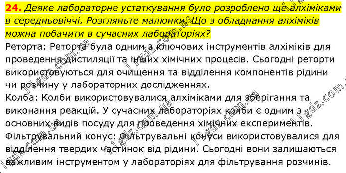Деяке лабораторне устаткування було розроблено ще алхіміками в середньовіччі. Розгляньте малюнки. Що з обладнання алхіміків можна побачити в сучасних лабораторіях? Реторта: Реторта була одним з ключових інструментів алхіміків для проведення дистиляції та інших хімічних процесів. Сьогодні реторти використовуються для очищення та відділення компонентів рідини чи розчину у лабораторних дослідженнях. Колба: Колби використовувалися алхіміками для зберігання та виконання реакцій. У сучасних лабораторіях колби є одним з основних видів посуду для проведення хімічних експериментів. Фільтрувальний конус: Фільтрувальні конуси використовувалися для відділення твердих частинок від рідини. Сьогодні вони залишаються важливим інструментом у лабораторіях для фільтрування розчинів.