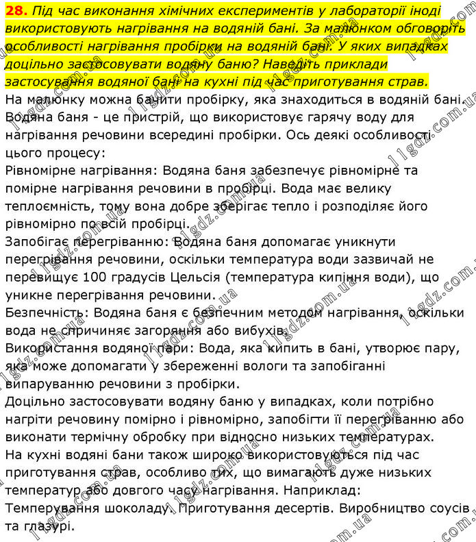 Під час виконання хімічних експериментів у лабораторії іноді використовують нагрівання на водяній бані. За малюнком обговоріть особливості нагрівання пробірки на водяній бані. У яких випадках доцільно застосовувати водяну баню? Наведіть приклади застосування водяної бані на кухні під час приготування страв. На малюнку можна бачити пробірку, яка знаходиться в водяній бані. Водяна баня - це пристрій, що використовує гарячу воду для нагрівання речовини всередині пробірки. Ось деякі особливості цього процесу: Рівномірне нагрівання: Водяна баня забезпечує рівномірне та помірне нагрівання речовини в пробірці. Вода має велику теплоємність, тому вона добре зберігає тепло і розподіляє його рівномірно по всій пробірці. Запобігає перегріванню: Водяна баня допомагає уникнути перегрівання речовини, оскільки температура води зазвичай не перевищує 100 градусів Цельсія (температура кипіння води), що уникне перегрівання речовини. Безпечність: Водяна баня є безпечним методом нагрівання, оскільки вода не спричиняє загоряння або вибухів. Використання водяної пари: Вода, яка кипить в бані, утворює пару, яка може допомагати у збереженні вологи та запобіганні випаруванню речовини з пробірки. Доцільно застосовувати водяну баню у випадках, коли потрібно нагріти речовину помірно і рівномірно, запобігти її перегріванню або виконати термічну обробку при відносно низьких температурах. На кухні водяні бани також широко використовуються під час приготування страв, особливо тих, що вимагають дуже низьких температур або довгого часу нагрівання. Наприклад: Темперування шоколаду. Приготування десертів. Виробництво соусів та глазурі.