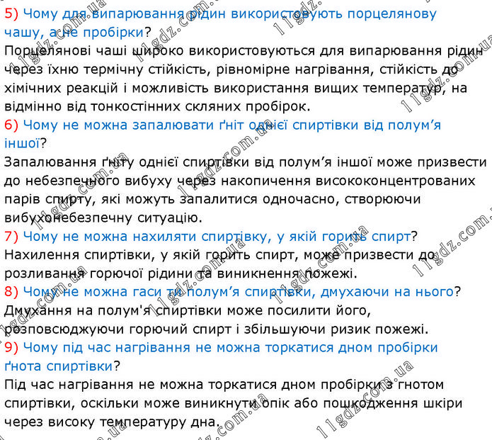 5) Чому для випарювання рідин використовують порцелянову чашу, а не пробірки? Порцелянові чаші широко використовуються для випарювання рідин через їхню термічну стійкість, рівномірне нагрівання, стійкість до хімічних реакцій і можливість використання вищих температур, на відмінно від тонкостінних скляних пробірок. 6) Чому не можна запалювати ґніт однієї спиртівки від полум’я іншої? Запалювання ґніту однієї спиртівки від полум’я іншої може призвести до небезпечного вибуху через накопичення висококонцентрованих парів спирту, які можуть запалитися одночасно, створюючи вибухонебезпечну ситуацію. 7) Чому не можна нахиляти спиртівку, у якій горить спирт? Нахилення спиртівки, у якій горить спирт, може призвести до розливання горючої рідини та виникнення пожежі. 8) Чому не можна гаси ти полум’я спиртівки, дмухаючи на нього? Дмухання на полум'я спиртівки може посилити його, розповсюджуючи горючий спирт і збільшуючи ризик пожежі. 9) Чому під час нагрівання не можна торкатися дном пробірки ґнота спиртівки? Під час нагрівання не можна торкатися дном пробірки з гнотом спиртівки, оскільки може виникнути опік або пошкодження шкіри через високу температуру дна.