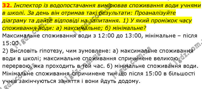 Інспектор із водопостачання вимірював споживання води учнями в школі. За день він отримав такі результати: Проаналізуйте діаграму та дайте відповіді на запитання. 1) У який проміжок часу споживання води: а) максимальне; б) мінімальне? Максимальне споживання води з 12:00 до 13:00, мінімальне – після 15:00 2) Висловіть гіпотезу, чим зумовлене: а) максимальне споживання води в школі; максимальне споживання спричинене великою перервою, яка проходить в той час. б) мінімальне споживання води. Мінімальне споживання спричинене тим що після 15:00 в більшості учнів закінчуються заняття і вони йдуть додому.