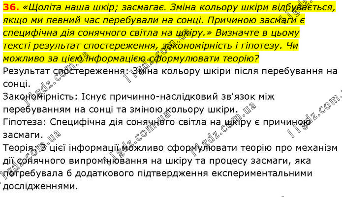 «Щоліта наша шкір; засмагає. Зміна кольору шкіри відбувається, якщо ми певний час перебували на сонці. Причиною засмаги є специфічна дія сонячного світла на шкіру.» Визначте в цьому тексті результат спостереження, закономірність і гіпотезу. Чи можливо за цією інформацією сформулювати теорію? Результат спостереження: Зміна кольору шкіри після перебування на сонці. Закономірність: Існує причинно-наслідковий зв'язок між перебуванням на сонці та зміною кольору шкіри. Гіпотеза: Специфічна дія сонячного світла на шкіру є причиною засмаги. Теорія: З цієї інформації можливо сформулювати теорію про механізм дії сонячного випромінювання на шкіру та процесу засмаги, яка потребувала б додаткового підтвердження експериментальними дослідженнями.