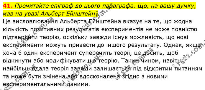 Прочитайте епіграф до цього параграфа. Що, на вашу думку, мав на увазі Альберт Ейнштейн? Це висловлювання Альберта Ейнштейна вказує на те, що жодна кількість позитивних результатів експериментів не може повністю підтвердити теорію, оскільки завжди існує можливість, що нові експерименти можуть привести до іншого результату. Однак, якщо хоча б один експеримент суперечить теорії, це досить, щоб відкинути або модифікувати цю теорію. Таким чином, навіть найбільш вдала теорія завжди залишається під відкритим питанням та може бути змінена або вдосконалена згідно з новими експериментальними даними.