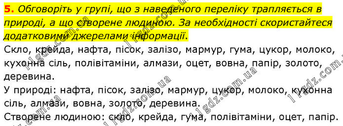 Обговоріть у групі, що з наведеного переліку трапляється в природі, а що створене людиною. За необхідності скористайтеся додатковими джерелами інформації. Скло, крейда, нафта, пісок, залізо, мармур, гума, цукор, молоко, кухонна сіль, полівітаміни, алмази, оцет, вовна, папір, золото, деревина. У природі: нафта, пісок, залізо, мармур, цукор, молоко, кухонна сіль, алмази, вовна, золото, деревина. Створене людиною: скло, крейда, гума, полівітаміни, оцет, папір.