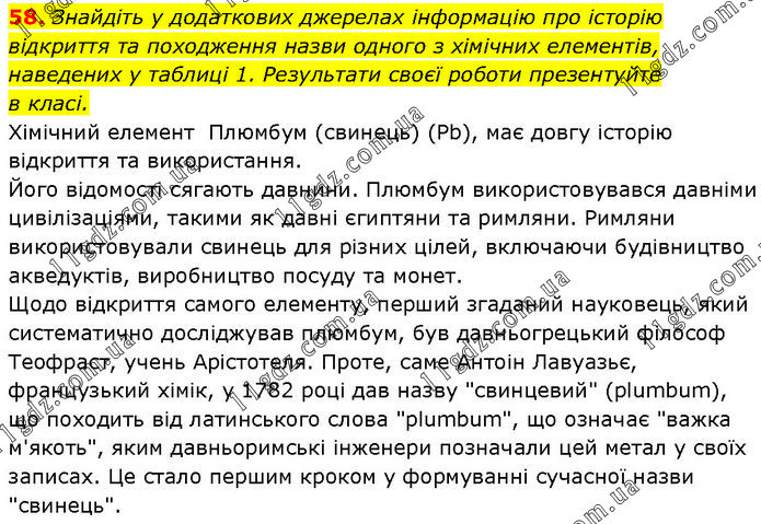 Знайдіть у додаткових джерелах інформацію про історію відкриття та походження назви одного з хімічних елементів, наведених у таблиці 1. Результати своєї роботи презентуйте в класі. Хімічний елемент Плюмбум (свинець) (Pb), має довгу історію відкриття та використання. Його відомості сягають давнини. Плюмбум використовувався давніми цивілізаціями, такими як давні єгиптяни та римляни. Римляни використовували свинець для різних цілей, включаючи будівництво акведуктів, виробництво посуду та монет. Щодо відкриття самого елементу, перший згаданий науковець, який систематично досліджував плюмбум, був давньогрецький філософ Теофраст, учень Арістотеля. Проте, саме Антоін Лавуазьє, французький хімік, у 1782 році дав назву "свинцевий" (plumbum), що походить від латинського слова "plumbum", що означає "важка м'якоть", яким давньоримські інженери позначали цей метал у своїх записах. Це стало першим кроком у формуванні сучасної назви "свинець".
