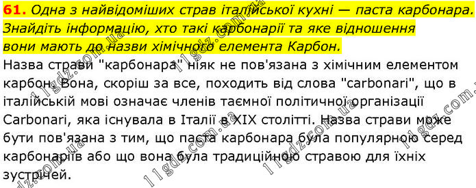 Одна з найвідоміших страв італійської кухні — паста карбонара. Знайдіть інформацію, хто такі карбонарії та яке відношення вони мають до назви хімічного елемента Карбон. Назва страви "карбонара" ніяк не пов'язана з хімічним елементом карбон. Вона, скоріш за все, походить від слова "carbonari", що в італійській мові означає членів таємної політичної організації Carbonari, яка існувала в Італії в XIX столітті. Назва страви може бути пов'язана з тим, що паста карбонара була популярною серед карбонаріїв або що вона була традиційною стравою для їхніх зустрічей.