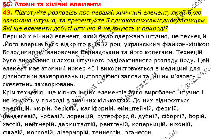 §5. Атоми та хімічні елементи 43. Підготуйте розповідь про перший хімічний елемент, який було одержано штучно, та презентуйте її однокласникам/однокласницям. Які ще елементи добуті штучно й не існують у природі? Перший хімічний елемент, який було одержано штучно, це технецій .Його вперше було відкрито в 1937 році українським фізиком-хіміком Володимиром Івановичем Вернадським та його колегами. Технецій було вироблено шляхом штучного радіоактивного розпаду йоду. Цей елемент має атомний номер 43 і використовується в медицині для діагностики захворювань щитоподібної залози та інших м'язово-скелетних захворювань. Крім технетію, ще кілька інших елементів було вироблено штучно і не існують у природі в значних кількостях. До них відносяться америцій, кюрій, берклій, каліфорній, ейнштейній, фермій, менделевій, нобелій, лоренцій, рутерфордій, дубній, сіборгій, борій, хассій, мейтнерій, дармштадтій, рентгеній, коперницій, ніхоній, флавій, московій, ліверморій, теннессін, оганесон.