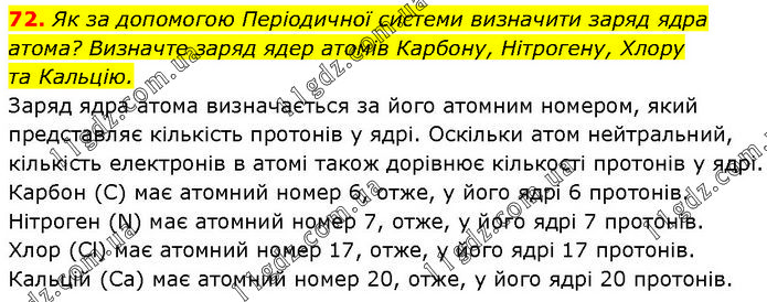 Як за допомогою Періодичної системи визначити заряд ядра атома? Визначте заряд ядер атомів Карбону, Нітрогену, Хлору та Кальцію. Заряд ядра атома визначається за його атомним номером, який представляє кількість протонів у ядрі. Оскільки атом нейтральний, кількість електронів в атомі також дорівнює кількості протонів у ядрі. Карбон (C) має атомний номер 6, отже, у його ядрі 6 протонів. Нітроген (N) має атомний номер 7, отже, у його ядрі 7 протонів. Хлор (Cl) має атомний номер 17, отже, у його ядрі 17 протонів. Кальцій (Ca) має атомний номер 20, отже, у його ядрі 20 протонів.