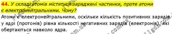 У складі атомів містяться заряджені частинки, проте атоми є електронейтральними. Чому? Атоми є електронейтральними, оскільки кількість позитивних зарядів у ядрі (протонів) рівна кількості негативних зарядів (електронів), які обертаються навколо ядра.