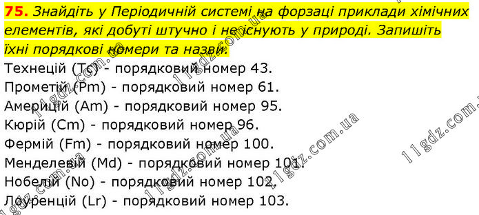 Знайдіть у Періодичній системі на форзаці приклади хімічних елементів, які добуті штучно і не існують у природі. Запишіть їхні порядкові номери та назви. Технецій (Tc) - порядковий номер 43. Прометій (Pm) - порядковий номер 61. Америцій (Am) - порядковий номер 95. Кюрій (Cm) - порядковий номер 96. Фермій (Fm) - порядковий номер 100. Менделевій (Md) - порядковий номер 101. Нобелій (No) - порядковий номер 102. Лоуренцій (Lr) - порядковий номер 103.