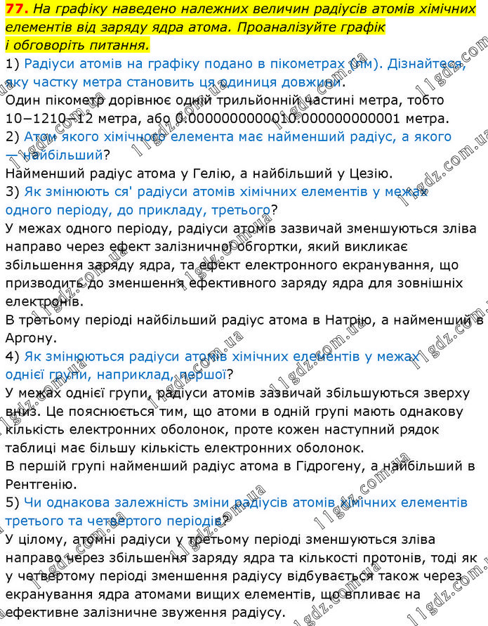 На графіку наведено належних величин радіусів атомів хімічних елементів від заряду ядра атома. Проаналізуйте графік і обговоріть питання. 1) Радіуси атомів на графіку подано в пікометрах (пм). Дізнайтеся, яку частку метра становить ця одиниця довжини. Один пікометр дорівнює одній трильйонній частині метра, тобто 10−1210−12 метра, або 0.0000000000010.000000000001 метра. 2) Атом якого хімічного елемента має найменший радіус, а якого — найбільший? Найменший радіус атома у Гелію, а найбільший у Цезію. 3) Як змінюють ся' радіуси атомів хімічних елементів у межах одного періоду, до прикладу, третього? У межах одного періоду, радіуси атомів зазвичай зменшуються зліва направо через ефект залізничної обгортки, який викликає збільшення заряду ядра, та ефект електронного екранування, що призводить до зменшення ефективного заряду ядра для зовнішніх електронів. В третьому періоді найбільший радіус атома в Натрію, а найменший в Аргону. 4) Як змінюються радіуси атомів хімічних елементів у межах однієї групи, наприклад, першої? У межах однієї групи, радіуси атомів зазвичай збільшуються зверху вниз. Це пояснюється тим, що атоми в одній групі мають однакову кількість електронних оболонок, проте кожен наступний рядок таблиці має більшу кількість електронних оболонок. В першій групі найменший радіус атома в Гідрогену, а найбільший в Рентгенію. 5) Чи однакова залежність зміни радіусів атомів хімічних елементів третього та четвертого періодів? У цілому, атомні радіуси у третьому періоді зменшуються зліва направо через збільшення заряду ядра та кількості протонів, тоді як у четвертому періоді зменшення радіусу відбувається також через екранування ядра атомами вищих елементів, що впливає на ефективне залізничне звуження радіусу.