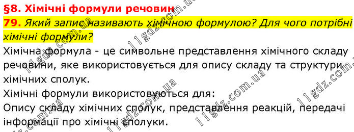§8. Хімічні формули речовин 79. Який запис називають хімічною формулою? Для чого потрібні хімічні формули? Хімічна формула - це символьне представлення хімічного складу речовини, яке використовується для опису складу та структури хімічних сполук. Хімічні формули використовуються для: Опису складу хімічних сполук, представлення реакцій, передачі інформації про хімічні сполуки.