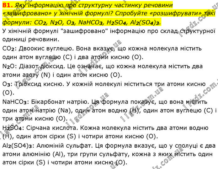 Яку інформацію про структурну частинку речовини «зашифровано» у хімічній формулі? Спробуйте «розшифрувати» такі формули: CO2, N2O, O3, NaHCO3, H2SO4, Al2(SO4)3. У хімічній формулі "зашифровано" інформацію про склад структурної одиниці речовини. CO2: Двоокис вуглецю. Вона вказує, що кожна молекула містить один атом вуглецю (C) і два атоми кисню (O). N2O: Діазот діоксид. Це означає, що кожна молекула містить два атоми азоту (N) і один атом кисню (O). O3: Тріоксид кисню. У кожній молекулі міститься три атоми кисню (O). NaHCO3: Бікарбонат натрію. Ця формула показує, що вона містить один атом натрію (Na), один атом водню (H), один атом вуглецю (C) і три атоми кисню (O). H2SO4: Сірчана кислота. Кожна молекула містить два атоми водню (H), один атом сірки (S) і чотири атоми кисню (O). Al2(SO4)3: Алюміній сульфат. Ця формула вказує, що у сполуці є два атоми алюмінію (Al), три групи сульфату, кожна з яких містить один атом сірки (S) і чотири атоми кисню (O).
