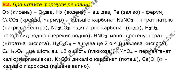 Прочитайте формули речовин: O2 (кисень) – О два, H2 (водень) – аш два, Fe (залізо) - ферум, CaCO3 (крейда, мармур) – кальцію карбонат NaNO3 – нітрат натрію (натрієва селітра), Na2CO3 - динатрію карбонат (сода), H2O2 перооксид водню (перекис водню), HNO3 моногідрогену нітрат (нітратна кислота), H2C2O4 – аш два це 2 о 4 (щавлева кислота), C6H12O6 - це шість аш 12 о шість (глюкоза), KMnO4 – перманганат калію(марганцівка), K2CO3 дикалію карбонат (поташ), Ca(OH)2 – кальцію гідроксид.(гашене вапно).