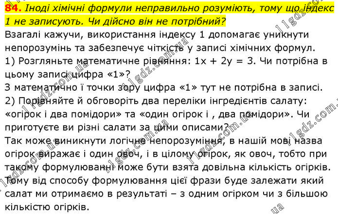 Іноді хімічні формули неправильно розуміють, тому що індекс 1 не записують. Чи дійсно він не потрібний? Взагалі кажучи, використання індексу 1 допомагає уникнути непорозумінь та забезпечує чіткість у записі хімічних формул. 1) Розгляньте математичне рівняння: 1х + 2у = 3. Чи потрібна в цьому записі цифра «1»? З математично ї точки зору цифра «1» тут не потрібна в записі. 2) Порівняйте й обговоріть два переліки інгредієнтів салату: «огірок і два помідори» та «один огірок і , два помідори». Чи приготуєте ви різні салати за цими описами? Так може виникнути логічне непорозуміння, в нашій мові назва огірок виражає і один овоч, і в цілому огірок, як овоч, тобто при такому формулюванні може бути взята довільна кількість огірків. Тому від способу формулювання цієї фрази буде залежати який салат ми отримаємо в результаті – з одним огірком чи з більшою кількістю огірків.